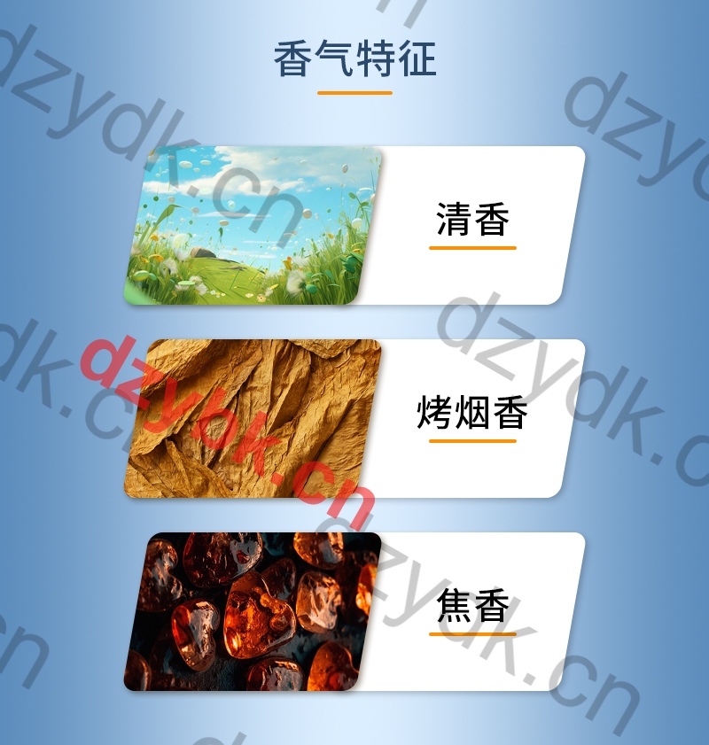 混合型烟草特征,头香辅以奶油香草气息清甜自然;尾调带有话梅酸甜香气修饰,清新爽口。