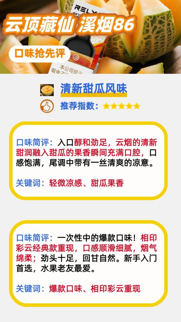 RELX悦刻飞流Mega云顶藏仙溪烟86国标一次性电子烟口味特点: