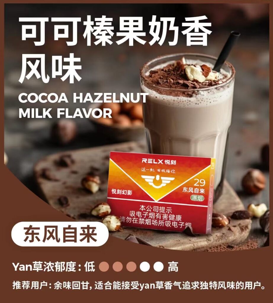 “东风自来”隶属于悦刻的“瀑烟”系列,该系列主打“外国风味烟草,香气独特” 。而这款“瀑烟29”则将“独特”二字发挥到了极致。它的风味核心,正是那诱人的可可榛果与焦甜烘焙香。