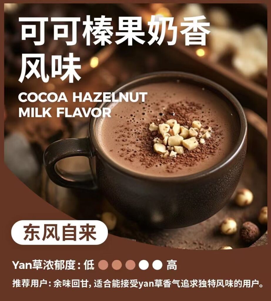 - 后调(柔和尾韵): 在风味的末端,烟草的基底才作为点缀轻轻浮现。根据官方图示,其“Yan草浓郁度”评级为“低”(2/5) ,这使得烟草味处理得非常柔和,丝毫不会抢走可可与榛果的主角光环,反而增加了一丝醇厚感,让整体风味甜而不腻,余味回甘 。