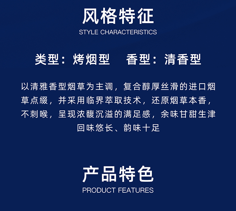 烤烟型,清香型,以清雅香型烟草为主调,复合醇厚丝滑的进口烟草点缀,并采用临界萃取技术,还原烟草本香不刺喉,呈现浓馥沉溢的满足感,余味甘甜生津回味悠长、韵味十足。