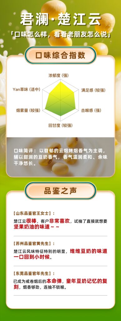 这是本次铂岚楚江云评测的核心。在国标产品普遍以烟草味为主的当下,楚江云巧妙地引入了“豆奶”元素,创造出了极具辨识度的风味。