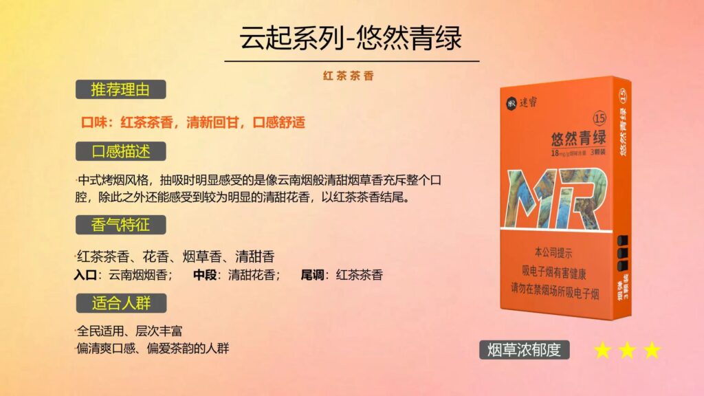 在国标电子烟市场中,茶味烟弹一直占据着半壁江山。从龙井的清冽 to 铁观音的醇厚,用户对“东方树叶”的热爱从未减退。然而,要找到一款真正能还原红茶温润特质的产品并不容易。MR迷睿近期推出的“悠然青绿”,虽然名字带“青绿”,实则暗藏玄机。今天,我们就通过这篇 迷睿悠然青绿评测,带大家深入了解这款主打“红茶茶香”的独特产品,看看它能否为您带来一份悠然自得的品吸体验。