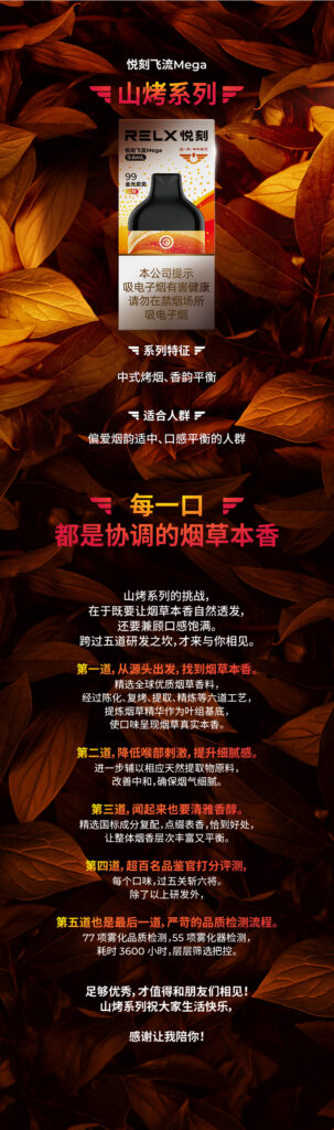 RELX悦刻飞流Mega金光奕奕山烤99国标一次性电子烟口味特点: