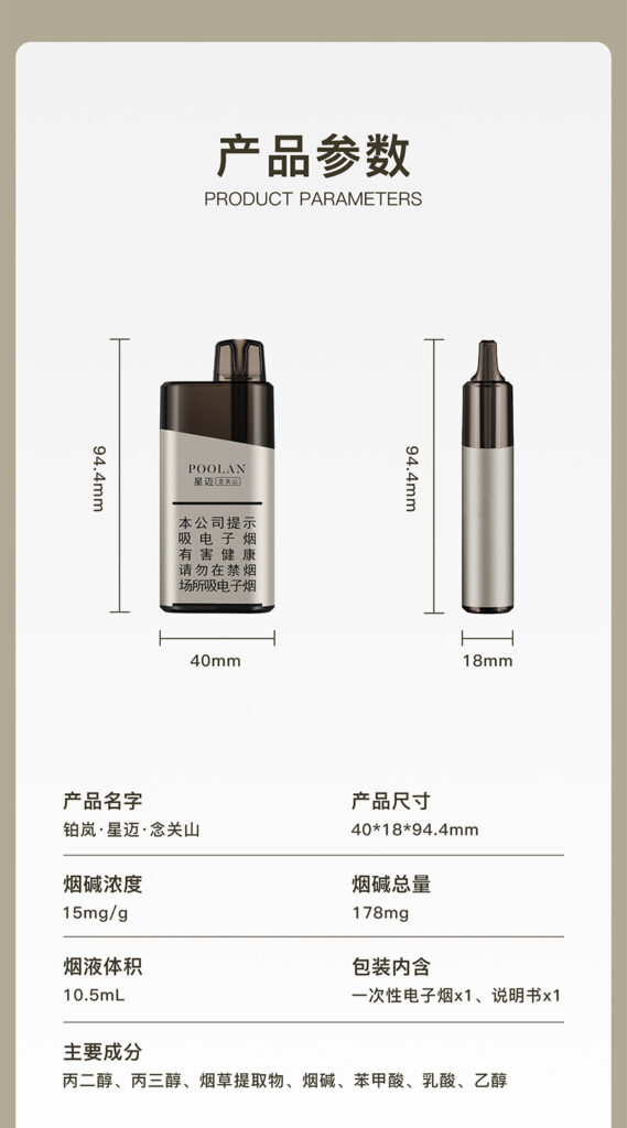 POOLAN铂岚星脉念关山国标一次性电子烟雾化物成分:丙二醇、丙三醇、烟草提取物、烟碱、苯甲酸、乳酸、乙醇